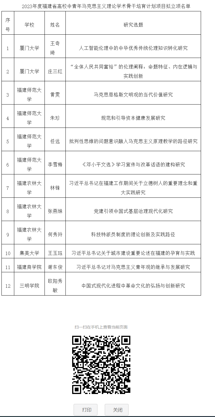喜讯: 根据《中共福建省委宣传部、中共福建省委教育工委、福建省社会科学界联合会关于实施2023年度福建省高校中青年马克思主义理论学术骨干培育计划项目申报工作的通知》(闽委教思〔2023〕19号)要求,经有关高校推荐、专家评审,拟立项厦门大学王奇琦的“人工智能伦理中的中华优秀传统伦理知识转化研究”等12项高校中青年马克思主义理论学术骨干培育计划项目,beat365谢东俊老师习近平总书记对马克思主义青年观的继承与发展研究获得立项。