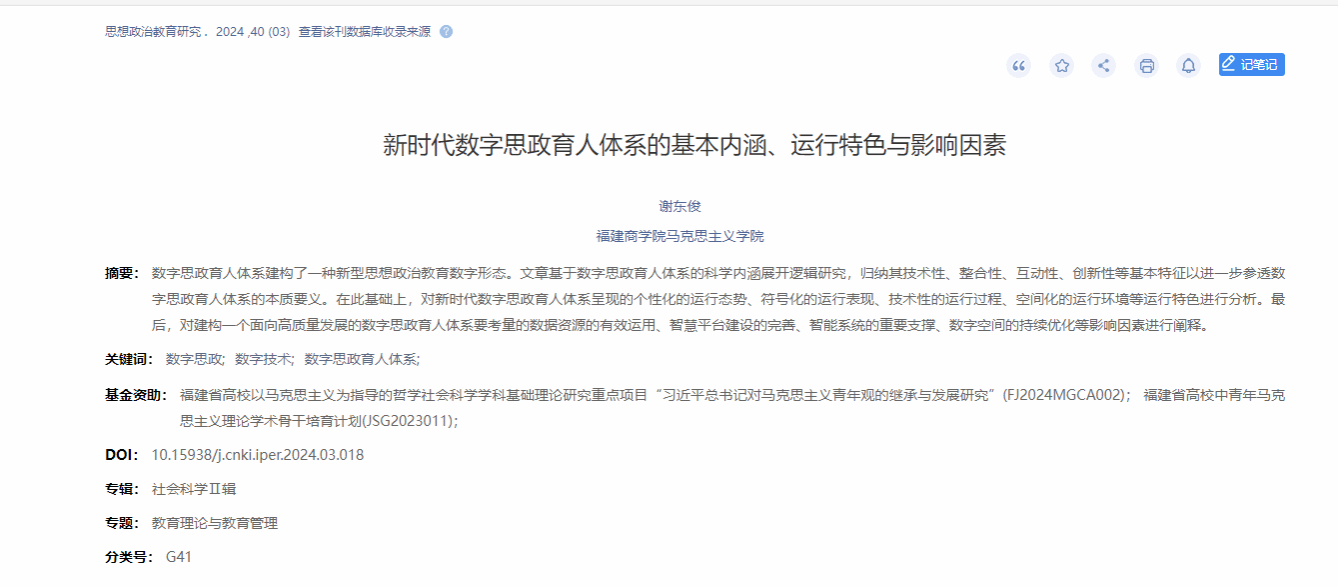 近日,beat365谢东俊副院长在北大核心期刊《思想政治教育研究》发表文章《新时代数字思政育人体系的基本内涵、运行特色与影响因素》