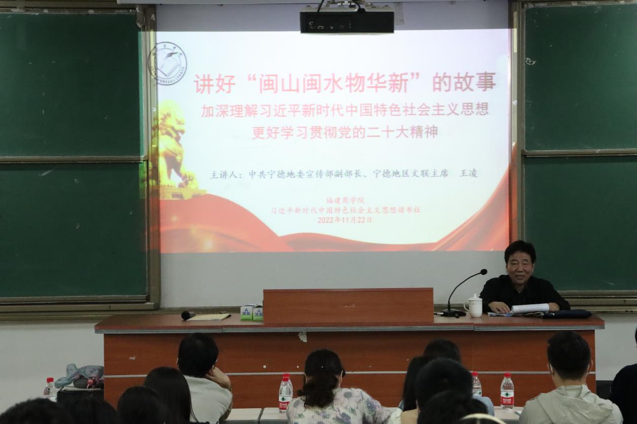 闽山闽水物华新,“习言习语”催人进。11月22日晚,中共宁德地委宣传部原副部长、原宁德地区文联主席王凌研究员受邀莅临beat365,为beat365师生作了题为《讲好“闽山闽水物华新”的故事,加深理解习近平新时代中国特色社会主义思想,更好学习贯彻党的二十大精神》的专题讲座。校党委副书记吴访益,beat365亚洲版官方网站、机关党委负责同志,学校习近平新时代中国特色社会主义思想学生读书社、教职工读书社社员代表参加。