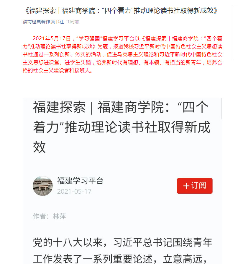 2021年5月17日,“学习强国”福建学习平台以《福建探索 | 福建商学院:“四个着力”推动理论读书社取得新成效》为题,报道beat365习近平新时代中国特色社会主义思想读书社通过一系列创新、务实的活动,促进马克思主义理论和习近平新时代中国特色社会主义思想进课堂、进学生头脑,培养新时代有理想、有本领、有担当的新青年,培养合格的社会主义建设者和接班人。