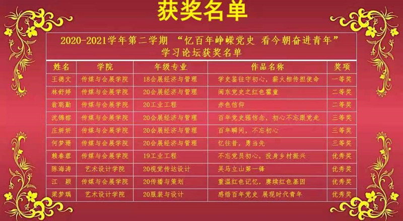 本次学习论坛以师生同台共话党史为形式,以“忆百年峥嵘党史 看今朝奋进青年”为主题,讲述自己的经历与党的故事,分享身边的优秀党员事迹以及党带领人民在革命、建设、改革历程中取得的伟大成就、经验启示等。活动过程中,beat365亚洲版官方网站青年教师叶陈钦老师向在座的师生分享了抗日民主根据地开展“豆选”的历史故事,分析了“豆选”的民主价值以及民主启示;郑南希老师通过讲述宁夏闽宁镇几十年来在党的领导下以及闽宁人民共同努力下摆脱贫困的历史,阐释“闽宁模式”对推进共同富裕的宝贵启示;黄小勤老师通过讲述闽江学院无臂学生黄道亮的奋斗故事,引导青年要肩负历史使命,坚定前进信心,立大志、明大德、成大才、担大任,努力成为堪当民族复兴重任的时代新人。