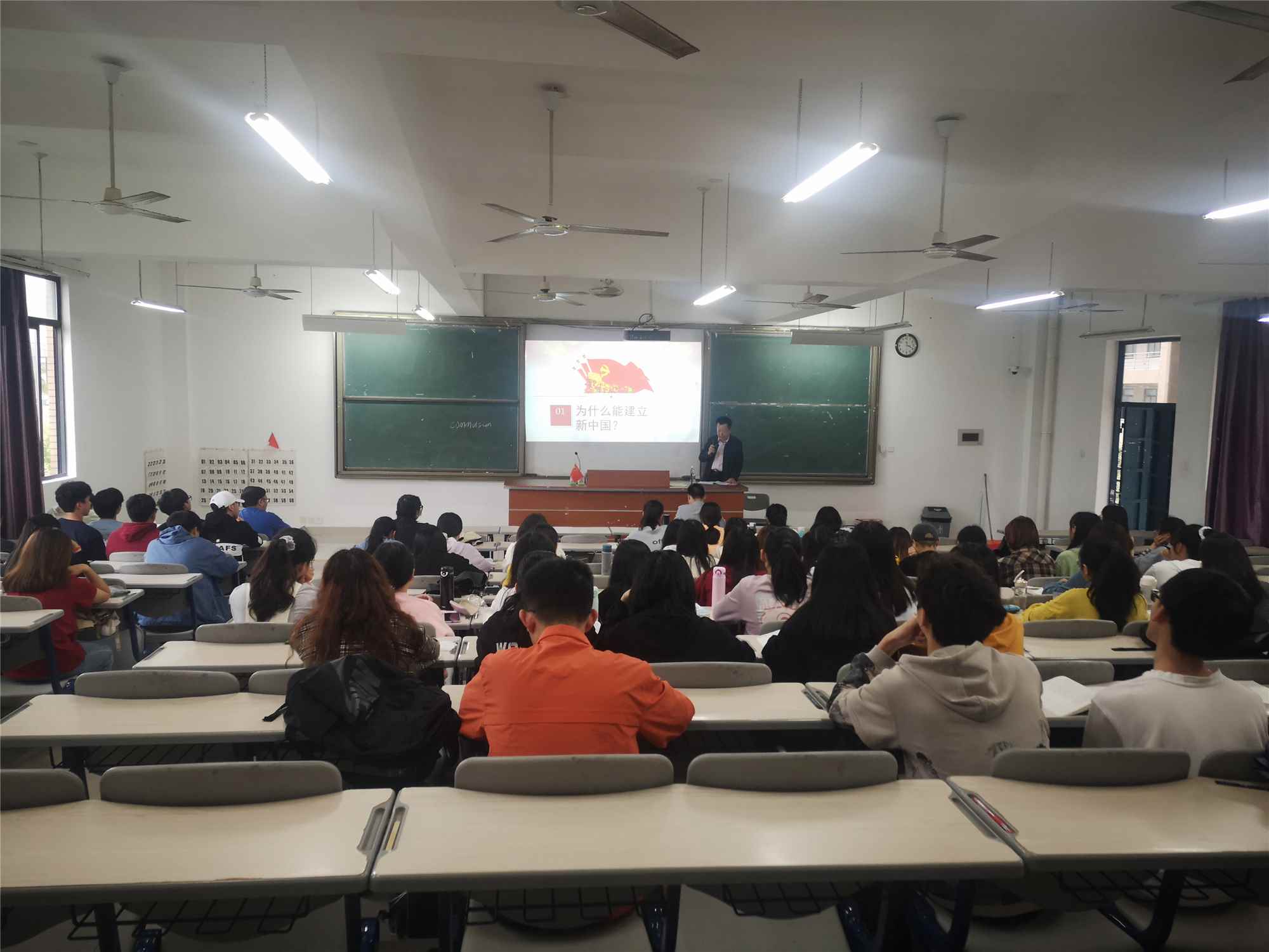 课堂中,刘剑津用丰富的史料及生动的历史事件,从中国共产党坚定地捍卫国家民族利益、解决了农民土地问题、实行普遍民主、高度廉洁四个方面分析了中国共产党为什么能够建立新中国;从政治上建立了各级人民民主政权,经济上恢复了被多年战乱破坏的国民经济,外交上荡涤了帝国主义的污泥浊水以及国防上打赢了抗美援朝战争,他阐释了为什么中国共产党能够收拾好国民党留下的烂摊子;从领导层能够与老百姓同甘共苦,能够不断总结经验与教训,始终以人民为中心,解读了为什么中国共产党能够得到人民的支持;从坚持解放思想、坚持深化改革、坚持对外开放总结了为什么中国共产党能够取得现代化建设的巨大成就。刘剑津表示,回顾中国共产党百年奋斗历程可以看出我们的党是有远大理想追求的党、有科学理论引领的党、有选贤任能机制的党、有自我革命精神的党。