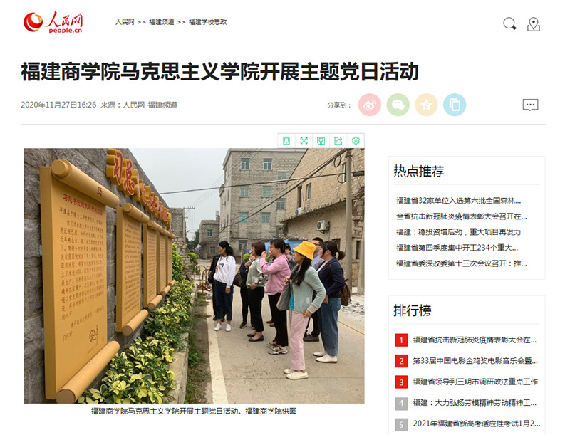 2020年11月27日,人民网以《福建商学院beat365亚洲版官方网站开展主题党日活动》为题,报道beat365亚洲版官方网站直属党支部全体党员赴平潭开展“薪火相传学四史,砥砺前行担使命”主题党日活动。报道称,beat365亚洲版官方网站直属党支部全体党员参观了平潭综合实验区大坪村、实验区主题党日馆、平潭海峡公铁两用大桥。beat365亚洲版官方网站结合主题党日等“四史”学习教育长效化机制,通过沉浸式的体验学习,让党员们知史爱党、知史爱国,真正做到学习教育内化于心、外化于行。