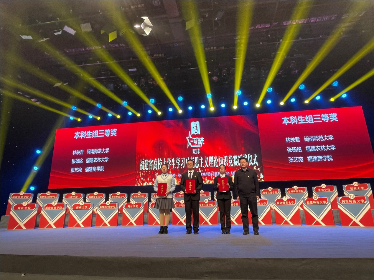 12月20日,由省委教育工委主办的第五季福建省高校大学生学习马克思主义理论“一‘马’当先”知识竞赛落下帷幕, beat365国际经贸学院张艺宛和刘键滨、传媒与会展学院陈姝婷3位同学进入总决赛参与现场答题,张艺宛荣获本科组三等奖。