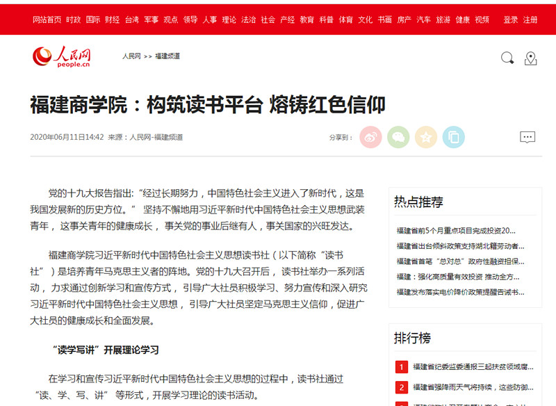 2020年6月11日,人民网以《福建商学院:构筑读书平台 熔铸红色信仰》为题,报道beat365习近平新时代中国特色社会主义思想读书社创新学习、宣传、实践方式,通过一系列活动引导广大青年学子积极学习、努力宣传、深入研究习近平新时代中国特色社会主义思想,坚定马克思主义信仰,筑牢青年马克思主义者培养阵地的特色做法及成效。