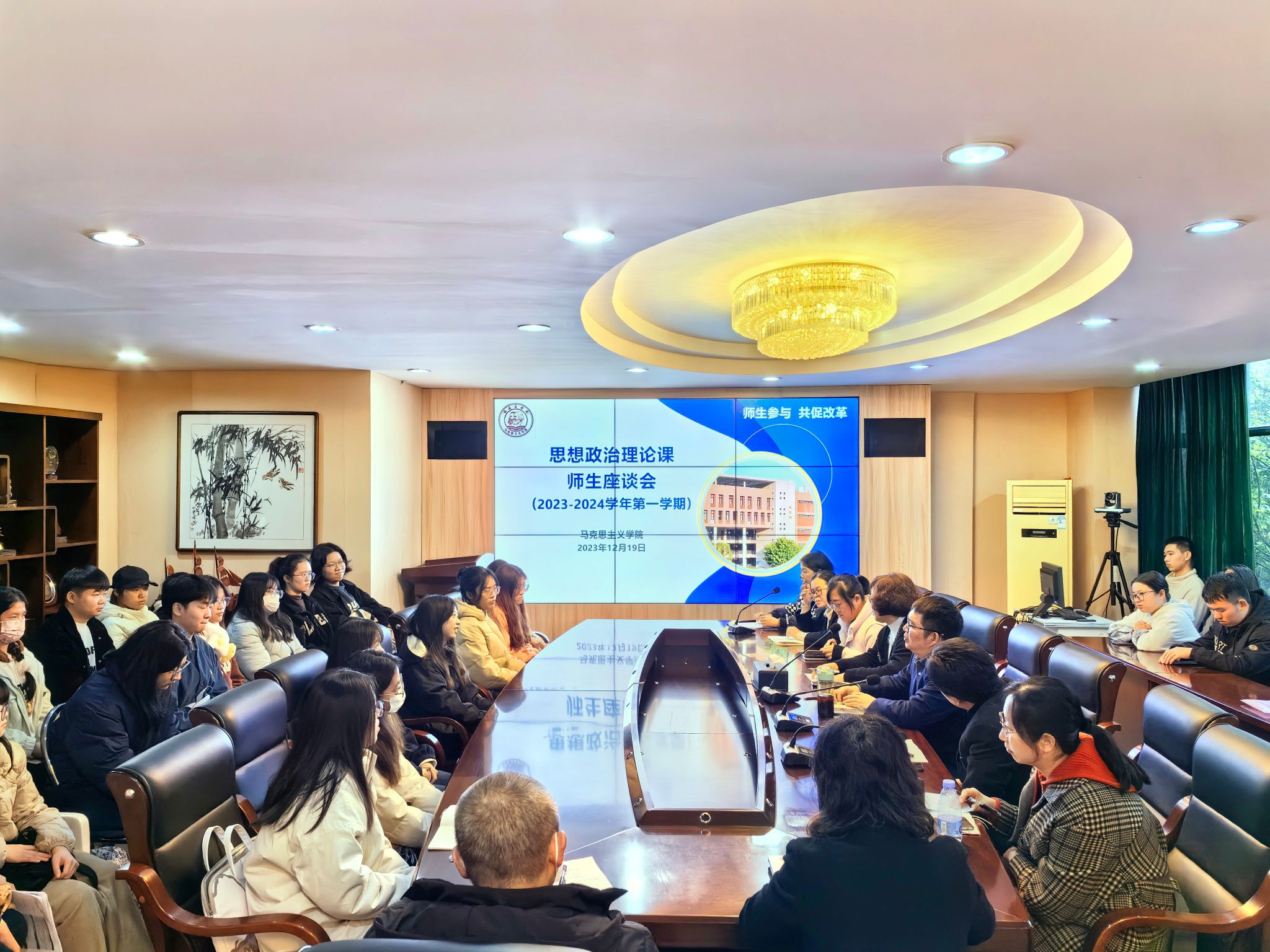 为更好促进思政课的教学和改革,提升学生在思政课中的获得感和对思政课的认同,12月19日下午,beat365在马尾校区召开2023-2024第一学期思想政治理论课师生座谈会。校教务处、质量监控与评估处有关人员,beat365亚洲版官方网站教师代表,马尾校区学生代表共40人参加了会议。
