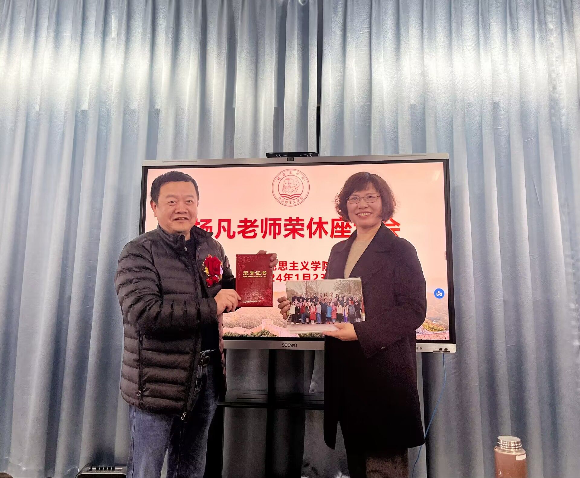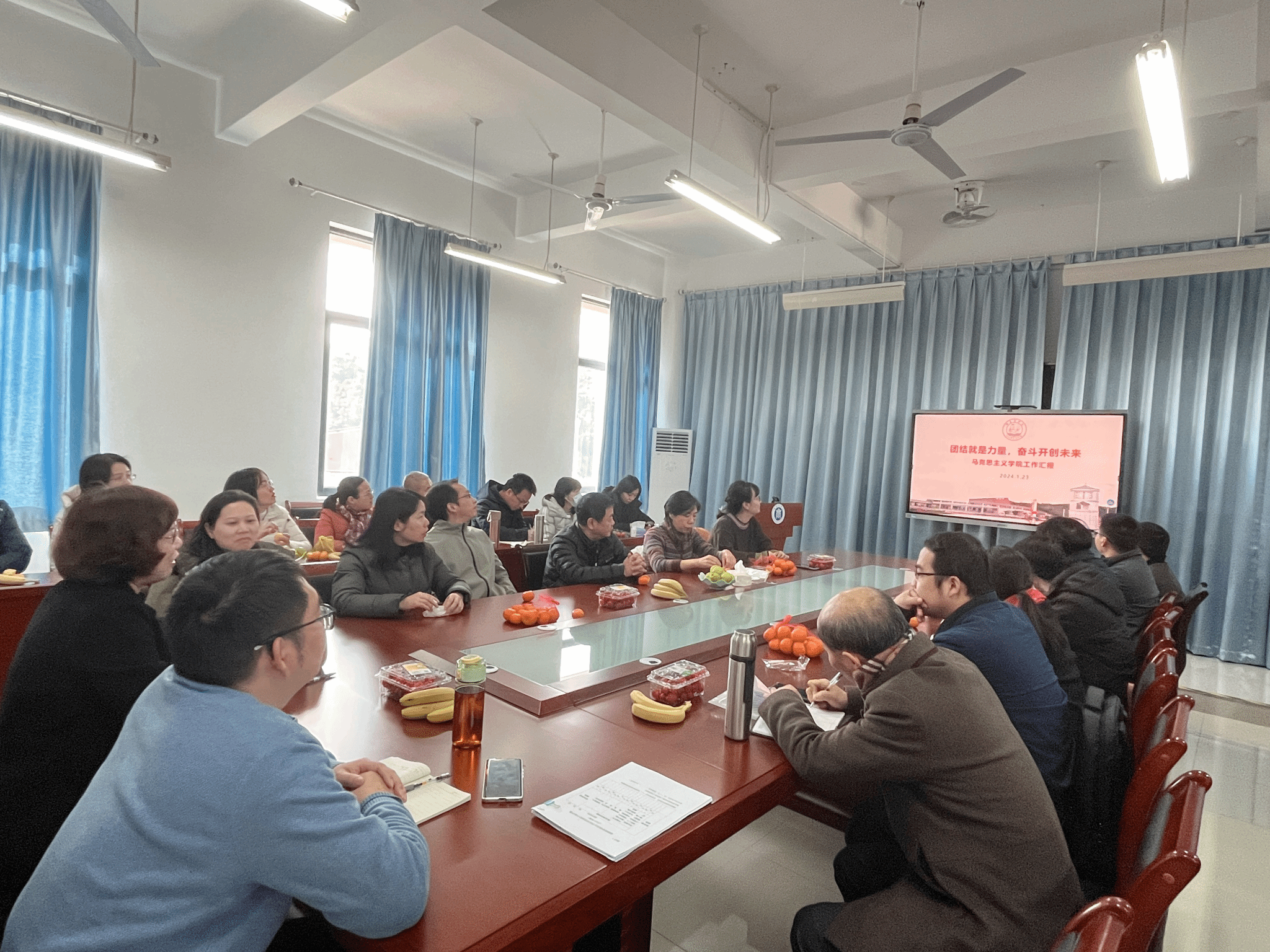 2024年1月23日下午,beat365召开本学期期末工作安排会议暨杨凡老师荣休欢送会。beat365亚洲版官方网站全体教师参加。