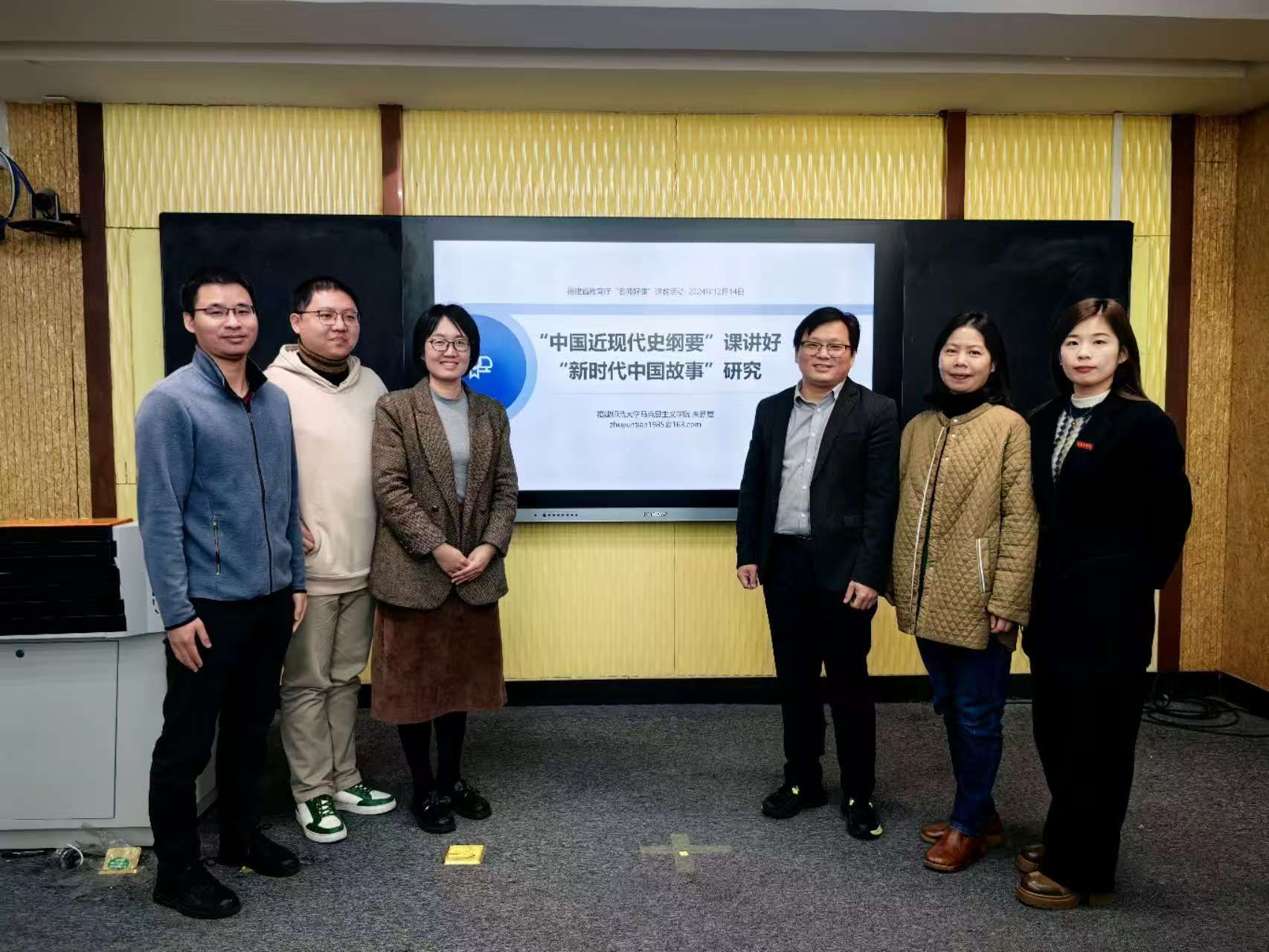 此前,12月14日,在由全国高校思政课“手拉手”集体备课中心(福建师范大学-福建省)主办,福州外语外贸学院beat365亚洲版官方网站、福建师范大学beat365亚洲版官方网站李颖名师工作室承办的集体备课会上,朱新屋老师以“‘中国近现代史纲要’课讲好‘新时代中国故事’研究”为题开设教学专题讲座。讲座分别从“‘头重脚轻’:一个被低估的学术难题”“把‘新时代’对象化:文献与事件”“重构教学体系:从中国道路到中国道理”等三个方面,就“中国近现代史纲要”课讲好“新时代中国故事”的价值意义、学理支撑和实践路径进行了深入分析。beat365中国近现代史纲要教研部全体教师参加了活动。