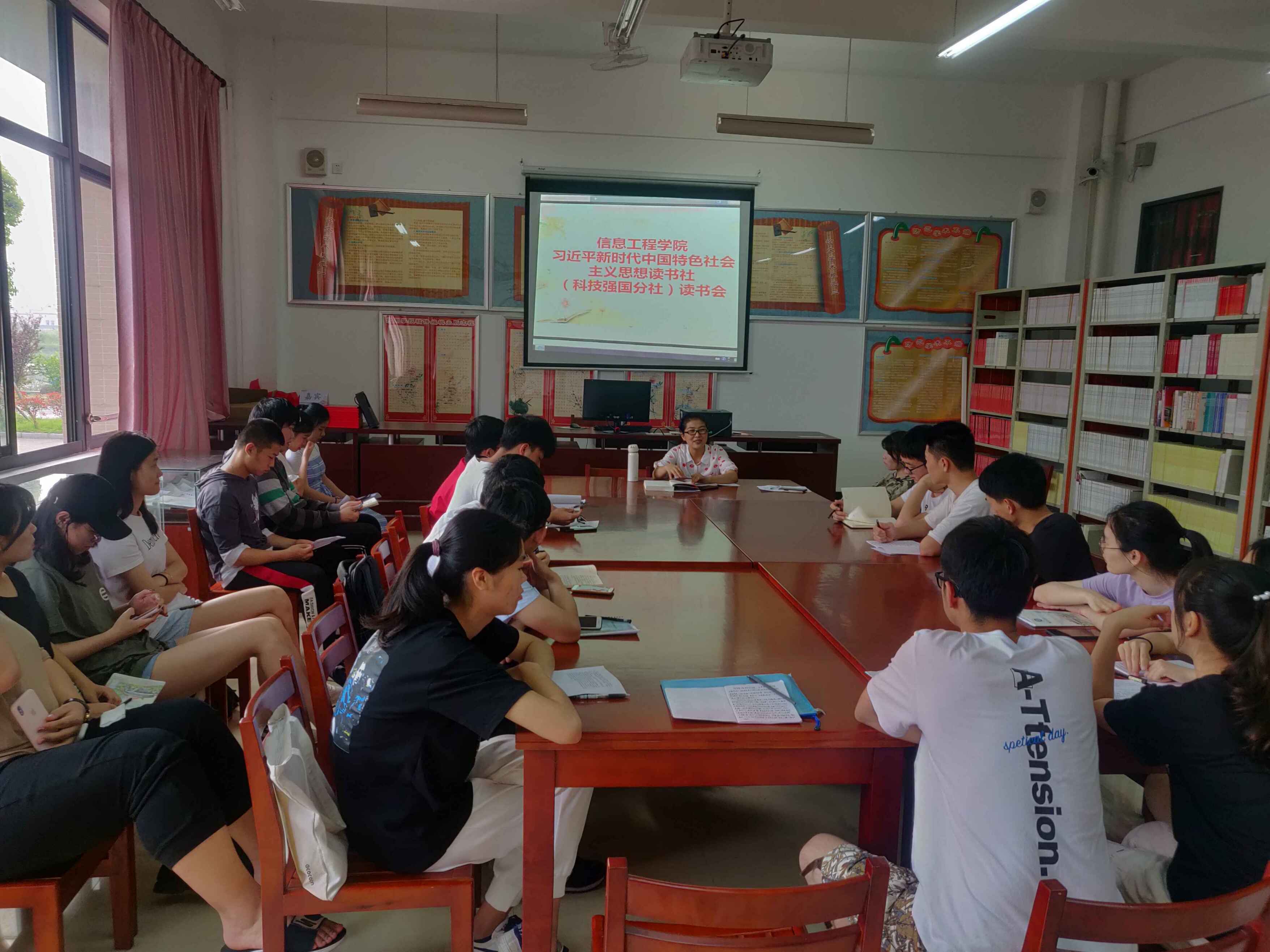 4月23日,信息工程系习近平新时代中国特色社会主义思想读书社(科技强国分社)在校读书社活动室开展读书活动,活动以“保持思想活力,滋养浩然之气”为主题。分社30余位同学和系指导老师吕谋琴共同参加此次活动。