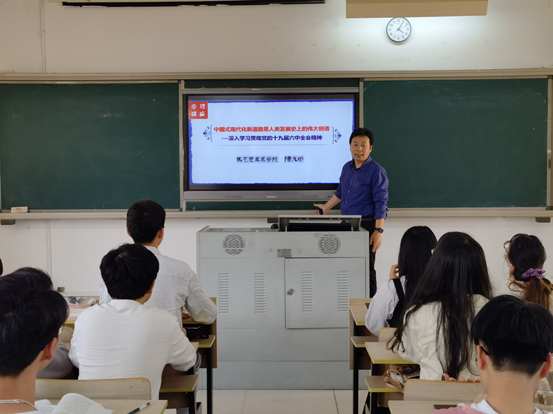 为进一步学习贯彻党的十九届六中全会精神,深刻领悟党百年奋斗的重要经验和教训,使青年学生认识到党和国家发展所处的新的历史方位和前进方向,坚定青年学生跟党走中国特色社会主义道路的信念,5月18日晚,beat365亚洲版官方网站陈火荣副教授应邀在马尾校区诚信楼201教室开展“中国式现代化新道路是人类发展史上的伟大创造”主题宣讲活动,校马列经典著作读书社社员参与学习。