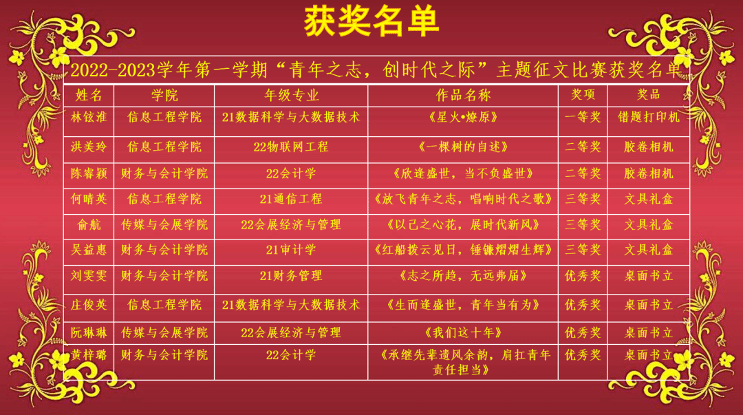 青年如朝日,青年兴则国兴。自11月活动开展以来,读书社全体社员热情投入、踊跃参加,经beat365亚洲版官方网站组织开展初选、复选,推出10篇优秀征文,经过评审,最终评出一等奖1名,二等奖2名,三等奖3名,优秀奖4名。