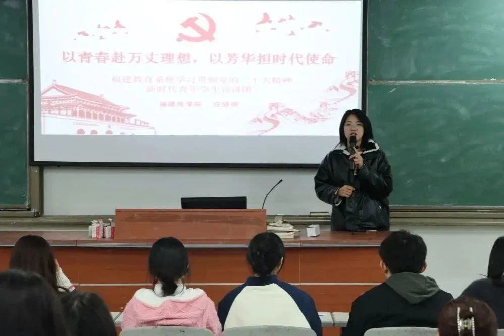 2023年3月13日晚,福建教育系统学习贯彻党的二十大精神新时代青年学生宣讲团成员兼校读书社社长庄妍妍同学于连江校区诚信楼中阶教室五开展主题为“以青春赴万丈理想,以芳华担时代使命”的宣讲活动,宣扬党的二十大精神,奋进青春磅礴力量,校习近平新时代中国特色社会主义思想读书社全体干部干事一同参与此次学习。