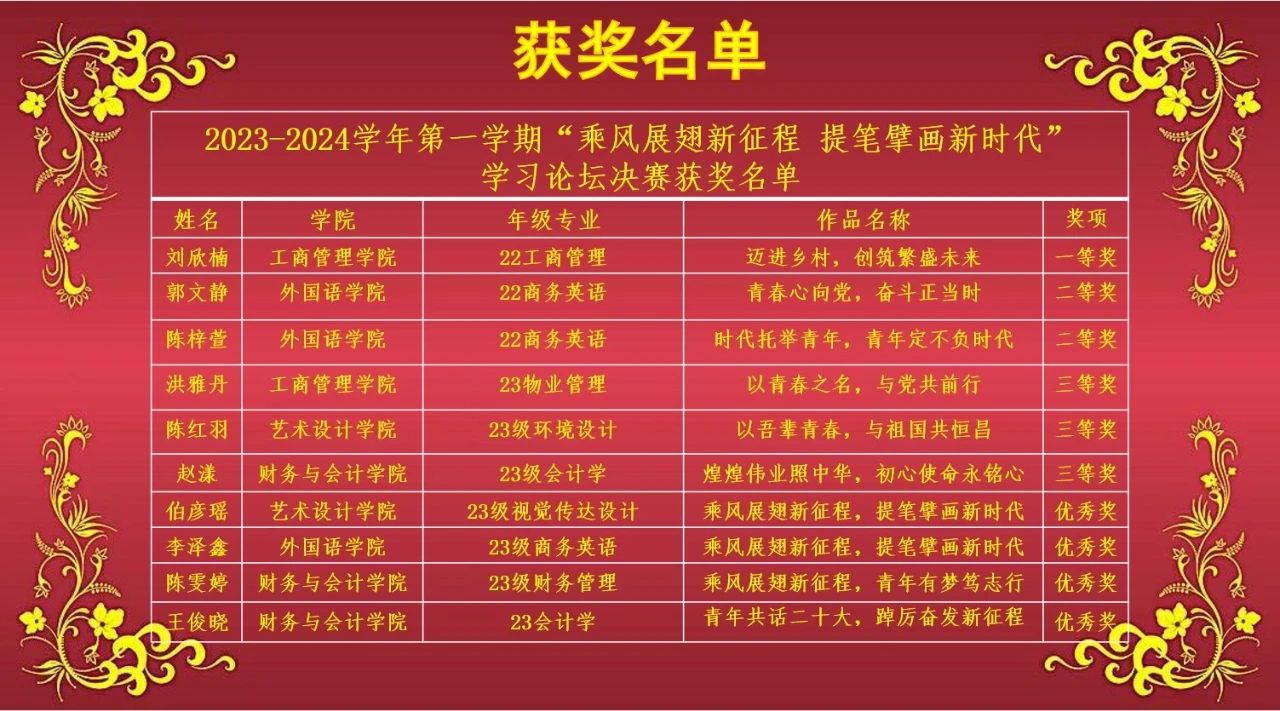 2023年12月5日下午,校习近平新时代中国特色社会主义思想读书社、校马列经典著作读书社在连江校区诚信楼中阶三教室举办了“乘风展翅新征程 提笔擘画新时代”主题学习论坛决赛。beat365亚洲版官方网站部分教师及校读书社社员逾200人参与了此次活动。