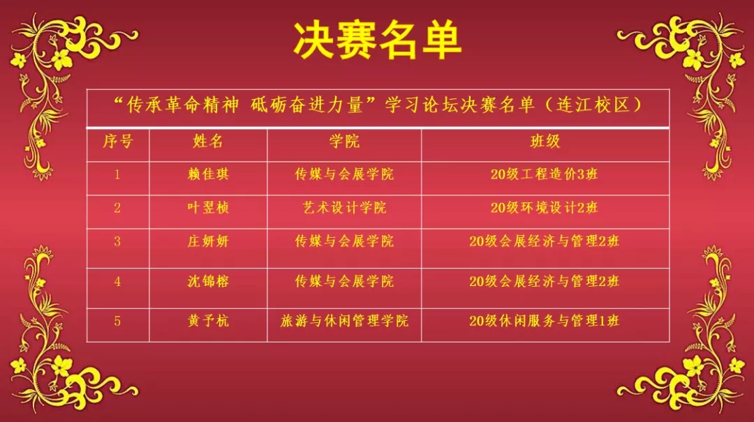 此次活动,校读书社(连江校区)共评选出5名同学进入学习论坛决赛,具体名单如下: