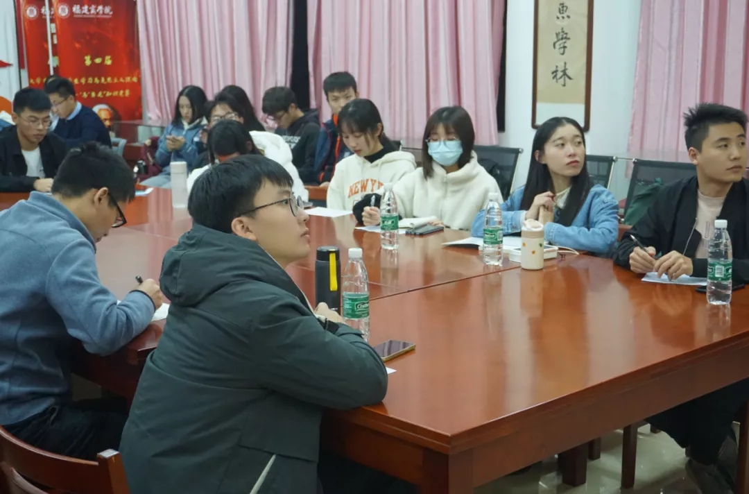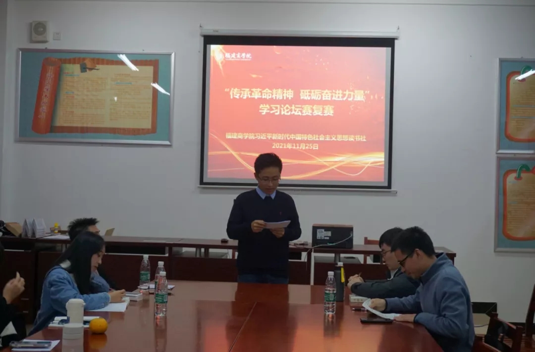 为进一步在青年大学生中深入学习贯彻党的十九届六中全会精神,学习、宣传、弘扬中国共产党人的伟大革命精神,传承中国共产党人的优秀品质和风骨情怀,砥砺奋进力量,校习近平新时代中国特色社会主义思想读书社于11月25日晚在连江校区自强楼活动室开展主题为“传承革命精神 砥砺奋进力量”学习论坛复赛,校读书社(连江校区)共有15名社员参加复赛。图书馆詹巧霞老师,校党委宣传部佘勉吾老师,校读书社指导老师赵敏、叶陈钦以及读书社社长丁小飞同学担任此次活动评委。