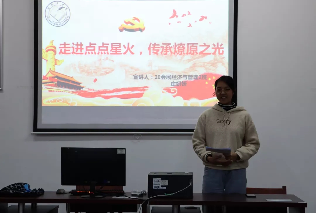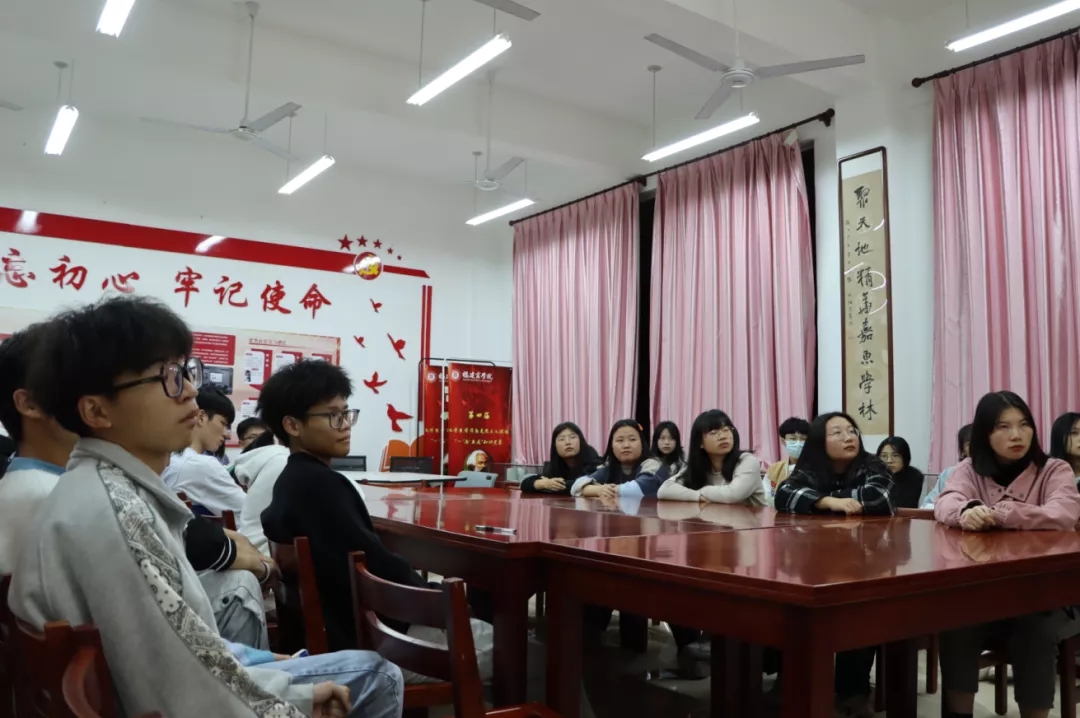 为进一步在青年大学生中深入学习贯彻习近平新时代中国特色社会主义思想,特别是深入学习领会党的十九届六中全会精神,理解中国共产党在百年奋斗中取得的伟大成就、历史经验,宣传中国共产党在百年奋斗中构建的中国共产党人的精神谱系,传承中国共产党人在中华民族伟大复兴征程中体现出的爱国情怀、高尚品格和精神风骨,汲取奋进力量,2021年11月26日,校读书社庄妍妍同学在连江校区自强楼读书社活动室开展了题为“走进点点星火,传承燎原之光”的宣讲活动,分享了自己的学习心得与感悟。读书社共有30多名社员参加学习活动。