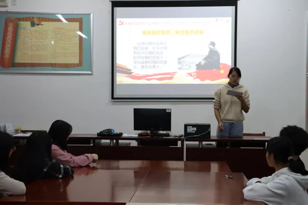 庄妍妍同学运用一个个生动的历史故事和一张张深入人心的历史照片向大家讲述了土地革命战争时期中国共产党人在井冈山革命根据地的奋斗历史和伟大成就,分析了井冈山精神的深刻内涵和历史意义,并且结合自身的发展和大家交流了青年大学生如何在新时代学习、弘扬井冈山精神。她在宣讲中认为,作为当代大学生,我们应该在学习、生活中认真、深入学习井冈山精神,追寻先辈革命足迹,将井冈山精神外化于自觉的行为,融入我们的日常生活,真正做到内化于心、外化于行。