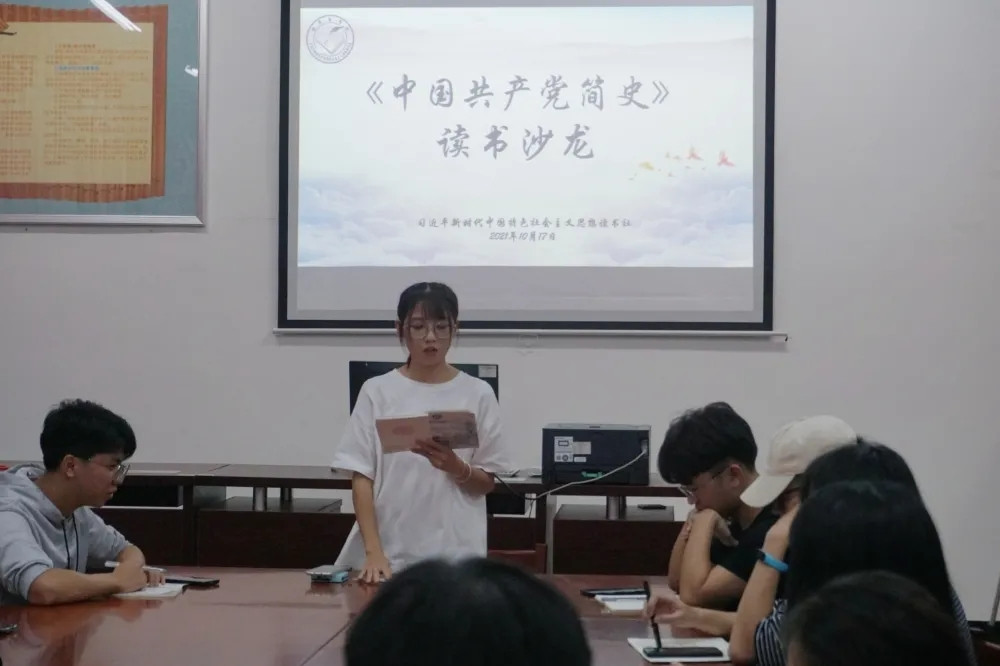 为进一步加深同学们对中国共产党100多年来伟大奋斗历程的学习,深刻理解党在各个历史时期淬炼锻造的伟大精神。校习近平新时代中国特色社会主义思想读书社于2021年10月17日晚在连江校区自强楼114活动室开展《中国共产党简史》读书沙龙活动。读书社全体学生干部干事共60多人参与此次活动,活动由读书社社长丁小飞同学主持。活动中,同学们互相探讨、深入交流学习《中国共产党简史》的心得体会。