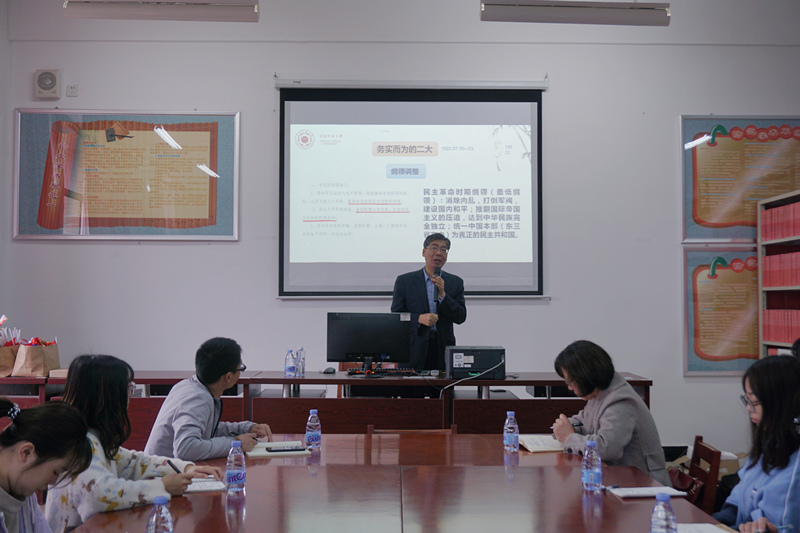 为认真学习贯彻落实习近平总书记在党史学习教育动员大会上的重要讲话精神,推动学校师生深入学好党史、新中国史、改革开放史、社会主义发展史,3月13日上午,闽南师范大学beat365亚洲版官方网站院长陈再生教授应邀莅临beat365开展题为“跟随大会学党史”的专题讲座。beat365亚洲版官方网站部分教师以及校习近平新时代中国特色社会主义思想读书社社员聆听了讲座。