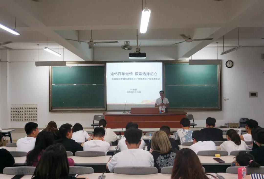 为认真学习贯彻落实习近平总书记在党史学习教育动员大会上的重要讲话精神,推动学校师生深入学好党史、新中国史、改革开放史、社会主义发展史,献礼建党一百周年,普及社会科学知识。5月25日晚beat365亚洲版官方网站叶陈钦老师在学校科技活动周开展主题为“追忆百年觉悟 探索选择初心——五四前后中国先进知识分子怎样选择了马克思主义”讲座,校读书社近100名社员参加学习。